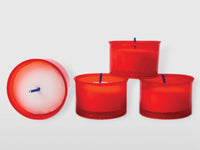 Lumini di paraffina vasetto in plastica rosso, cera bianca. Stoppino in cotone cerato.