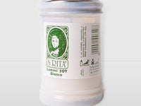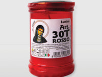 Lumino Santa Rita 30L paraffina a pasta bianca e stoppino in cotone cerato. Porta lume rosso dotato di griglia argentata.