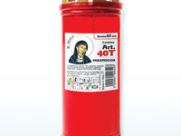 Lumino Santa Rita 40L paraffina a pasta bianca e stoppino in cotone cerato. Porta lume rosso dotato di parapioggia dorato.
