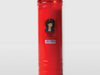 Lumino Santa Rita 60T Liturgico Pesante, con paraffina a pasta bianca e stoppino in cotone cerato. Porta lume rosso dotato di griglia argentata.