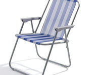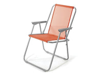 Sedia pieghevole con struttura in metallo, seduta e schienale in textilene e poggiabraccio in plastica.